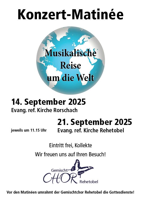 Am Sonntag, 21. September 2025, 11.15 Uhr, singen wir in der Evang.-reformierten Kirche Rehetobel unter dem Motto “Musikalische Reise rund um die Welt” Lieder aus dem benachbarten Ausland, machen aber auch musikalische Abstecher nach Afrika, Mittel- und Lateinamerika oder in die Karibik -und das alles ohne lange Reisezeit oder Flugzeug. Bei einigen Liedern werden wir vom Klavier oder einer Cajón (Kistentrommel) begleitet.